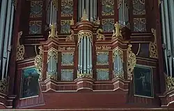Investigation of the organ's interior found that more original material had survived than previously suspected: many parts of the mechanism, and many pipes, were old but no longer in their original places. All pipes later than Schnitger's were replaced, especially the mixtures and the reeds – a total of 1,301 pipes.[6] Schnitger's wind-chests survived, as did the tracker mechanism of the Oberwerk, while Wegscheider reconstructed the Rückpositiv and pedal actions. Wilhelmy's keyboards (c. 1800) were retained, including his shove-coupler. Wind pressure tests shewed best results with the relatively high pressure of 84 mm. The 3-rank Cimbel is a fourth-sixth-cimbel, as described by Michael Praetorius in his Organographia (1619).[7]