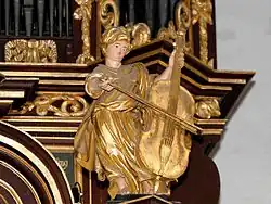 During the French occupation at the beginning of the 19th century, the monastery church in Hamburg served as a magazine. The organ was dismantled and stored in 1813 by Joachim Wilhelm Geycke; the Church was demolished in 1829, and later the monastery also. The organ was sold to Cappel by the Petrikirche in Hamburg for 600 Reichstaler.[13] After a fire in 1810 a new church had been built in Cappel (1815–1816), but the community could not afford a new organ. A delegation from Cappel traveled to Hamburg on 16 June 1816 to collect the organ. Geycke and Johann Heinrich Wohlien packed the organ in wooden boxes, which were transported from Hamburg to Cuxhaven by ship.[14] On June 29, 1816, the transfer of the organ was completed. Johann Georg Wilhelm Wilhelmy (Stade) signed a contract in which he undertook to rebuild the organ for 385 Reichstaler and set it up. The main case had to be shortened. For the flame ornaments in front of the feet of the front pipes in the middle tower of the Rückpositivs, which represent a stylistically strikingly foreign element, Wilhelmy used broken parts of carved angel wings, which are still missing from the angels on the Rückpositiv.[15] The round segments next to the middle tower of the Rückpositiv are probably attributable to Wilhelmy. In addition, Wilhelmy was commissioned to install a Zimbelstern. Due to the lower ceiling height compared to Hamburg, the Christ and angel figures could no longer be placed on the main case and were instead used on the pulpit and altar. Since this alteration, John the Baptist, the middle figure on the Rückpositiv, no longer points with his index finger to the Christ figure, but into a void.[8] In 1890, the Stade organ builder Johann Hinrich Röver replaced Schnitger's bellows with three large wedge bellows, resembling those of Schnitger in construction, providing a comparable breathing wind supply.[6] Until 1927, the instrument was maintained by various organ workshops from Stade, without interfering with its historic substance.