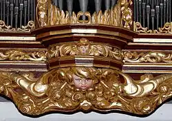 The relatively broad cases of the Hauptwerk and Rückpositiv are both divided into five parts and are matching in shape. In both cases, the elevated polygonal central tower is connected to the lateral pointed towers by two-storey pipe-flats in which dummy pipes are used (as in the Schnitger organ in Nieuw Scheemda). The pointed side towers and flats of the two cases are respectively united under a common cornice in composite style. Elaborately designed mechanisms connect to the narrower lower case with the console.[7] The richly decorated cornices, stands and friezes of the facade echo the appearance of the previous instrument, or perhaps parts of the old ornamentation were re-used.[8] The new carving was created by the Hamburg sculptor Christian Precht.[9] The detail of the pipe-shades features floral elements exclusively in the main case, but the Rückpositiv adds flowers, fruits, grimaces, stylized animal heads and – in the lower part of the Rückpositiv – three angel heads.[10]