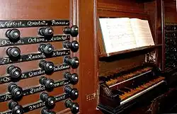 From 1939 a first repair was made by Paul Ott, who also took care of the organ in 1950–1952 in the recordings of Helmut Walcha. In 1976/1977 the organ was repaired by Rudolf von Beckerath Orgelbau (Hamburg) after heating damage and the organ's historical substance was secured. The equal temperament from 1816 was maintained. The Cornet 2′ had to be supplemented with a new upper octave, as it had been converted into a trumpet 4′. The cymbale was restored to its original composition.[17] In 2009, the bellows mechanism was restored by Beckerath and church back wall restored.