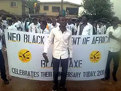 Behind the welfare facade of the Neo Black Movement[13] hides indeed the most dreaded Nigerian campus cult, the Black Axe confraternity.[14] NBM usually state that they are not identical with Black Axe for propaganda purposes. While the atrocities committed by campus cult members are well-known, very little is known about other activities of the Neo Black Movement.[15] Offiong claims that the group's initial goal of promoting Black Consciousness and fighting for the dignity of Africans and their freedom from neo-colonialism has deteriorated into self-serving behaviour that is "notoriously and brutally violent".[16] He maintains that violence has in fact become the cult's official policy.[17]