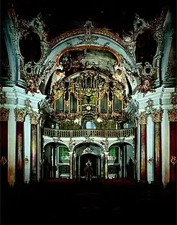 Developments during the 1990s included the restoration of several important concert hall organs: Görlitz Stadthalle (1910 Sauer organ; 1991; 4/71); Heidelber Stadthalle (4/56); and Prague, Smetana-Saal (1912 Voit und Söhne, 1995–96; 3/70). The construction of large instruments in a late-nineteenth-century style was also completed at Aschaffenburg, Herz-Jesu Kirche (1995; 4/63); Munich, Bürgersaalkirche (1994; 3/50); Kitzingen, Stadtpfarrkirche St. Johannes (1996; 3/54); and Jülich, Probsteikirche (1998; 3/45). The Jülich organ contains accessories including thunder rolls, rain machine, and a croaking bullfrog. Vleugels also built new organs in the South German style in historic cases at Würzburg, Käppele (1991; 2/31) and Schäftlarn Benediktinerabtei (1996; 2/31). There were new directions in constructing cases using special materials - a glass case for the Christopherus-Kapelle of the Franz-Josef-Strauss airport in Munich (1/6) - and dramatic artistic effects with contemporary painting as in Kitzingen, Stadtpfarrkirche St. Johannes (1996; 3/54) and Runding, St. Andreas (1998, 2/36). Finally the 1990s saw the restoration of several historic organs in Germany: Gaibach, Heilig-Kreuz-Kapelle (1699 Schleich organ; 1989–90; 1/7); Gaibach, Pfarrkirche (1748 Seuffert organm 1997; 1/12); Mainz Budenheim (1747 Kohlhaas organ); and Laumersheim in der Pfalz (1717 Hoffmann organ).[1]