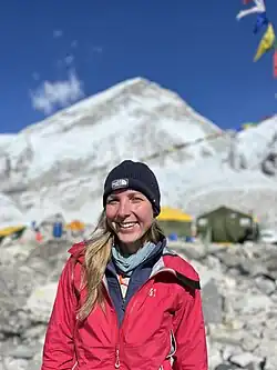 In 2023, she embarked on an assault of Mount Everest. During the expedition, she was caught in a serac fall in the Khumbu Icefall. Severely injured, she had to be urgently evacuated.[20] After a stay in a hospital in Kathmandu, she continued her ascent, reaching the summit of Everest (8,848 m) on May 17, 2023.[21][22][23][24][25][26][27] Despite frostbite on her fingers and a foot fracture that occurred during the descent at the Yellow Band at 7,700 m, she managed to descend.[28][29][30][31][32] Her journey is the subject of a documentary film with TV8 Mont-Blanc, Injam Production, and Capitello Group. She also wrote another book Au cœur de l’Everest: la quête d’une femme au sommet (To the Heart of Everest : A Woman’s Journey to the Summit), published by Mareuil Editions.[33] In this book, she shares her inner journey, her connection to the sacred, and her reflections on resilience, particularly in the face of the extreme risks associated with high-altitude.[34] The narrative also aims to dismantle clichés and misconceptions about climbing Everest, revealing a reality far removed from the images often portrayed.[35]