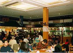 There was a full-service sushi bar, izakaya, okonomiyaki restaurant and ramen bar, a café, as well as a food court offering bento boxes, kushiyaki, donburi such as unatamadon noodles, and other Japanese foods. A wagashi-ya operated and Minamoto Kitchoan used Yaohan Plaza to establish a London presence.[5][8] Expatriates from Mino operated 'Utsuwa no Yakata', which sold Japanese porcelain and tablewares.[9] The main hall hosted fairs for products such as imported antiques as well as car promotions and cultural displays such as kimono.[7][5]