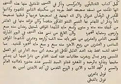 At the end of the Pauline epistles, and at the end of the Acts (see image), are two important Arabic colophons, in which the pedigree of the manuscript is given. From these we learn that both portions of this manuscript were written A. Mart. 1024, i.e. A.D. 1308, by Abu Said ben Said al Dar ibn Abu al Fadl, the Christian. They were copied, however, from a previous manuscript in the handwriting of the patriarch Abba Gabriel and bearing the date A. Mart. 966, i.e. A.D 1250. This manuscript of Abba Gabriel again was copied from two earlier manuscripts, that of the Pauline epistles in the handwriting of Abba Yuhanna, bishop of Sammanud, that of the Catholic epistles and Acts in the handwriting of "Jurja ibn Saksik the famous scribe" (or Zagazig).[3][4][5]