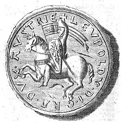 From the 1140s, the coat-of-arms seal spread geographically throughout southern Europe.[Ni 2] Around 1155, Raymond V of Toulouse imitated his enemy Ramon Berenguer IV, Count of Barcelona, and had the Toulouse cross engraved on his seals and coins.[25][26][Ni 2] In Italy and Central Europe, also in the 1150s, Welf VI, Duke of Spoleto and Marquis of Tuscany, Henry II Jasomirgott, Duke of Austria, and Ottokar III of Styria adopted seals with armorial shields. In the Kingdom of León, the choice of the lion as emblem (canting arms) on the coins of Alfonso VII from 1134 onwards, then on the charters of his son Ferdinand II of León, also shows the success of this fashionable heraldic figure.[Ni 2]