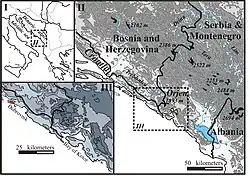 Orjen comprises transboundary area of about 400 km2 between Bosnia and Herzegovina and Montenegro, and runs for 25 km from region around Trebinje in Bosnia and Herzegovina in the north-west, to Bay of Kotor in Montenegro in the south-east. Mount Orjen is composed of four high karstic plateaux divided by ridges. Three near parallel ridges collide in Veliki kabao, Orjens' culmination point. The ridges are arranged by elevation with the highest to the north screening the Bijela gora plateaux from the Mediterranean coast. The separated plateaux are the Krivošije to the East, Bijela gora to the North, and Dobri do and Vrbanj to the West. Only few settlements are scattered in surrounding poljes. The poljes of Grahovo, Dragalj, Vrbanj, Krusevica and Grabalj are important for agricultural use and provide the only lines of communication in the karst. Migration circled around Mount Orjen as a major obstacle between the coastal, Herceg Novi and Risan and the interior towns of Grahovo, Trebinje and Nikšić.