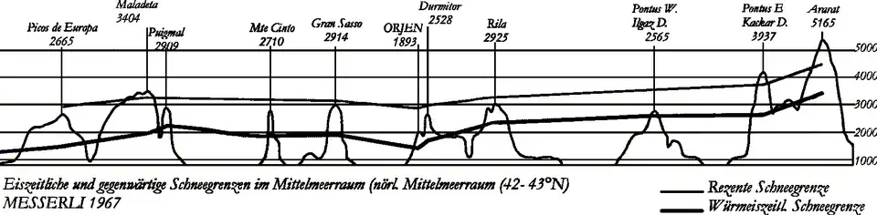 Mediterranean mountains bear no glaciers any more except small snow fields in some shaded cirques of the Taurus range. Even during the pleistocene snowlines were not much lower as in today's Alps. Glaciers were only of local significance in the Mediterranean enabling frost sensitive vegetation types to survive the climate changes of the Quaternary. Among the once glaciated Mediterranean mountains Orjen was outstanding for one of the biggest ice cap in the region. A 150 km2 covered 1/3 of the area. All part above 900 m were buried under a thick sheet of ice from where several glacial tongues descended to 500 m above sea level. Traces of glacial activity are evident in any part of Orjen as in the Bijela gora plateaux. No glacial lakes survive today as they were extinguished due to the porosity of the karstified landscape. Many cirques, U-shaped valleys and moraines and jagged ridges and summits bear the evidence of the glacial erosion.