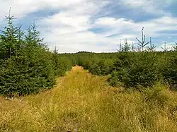 All types of forestation can be found here: spruce forest, mixed forest,[c] and deciduous forest, with spruce forest predominating.[6][7] On the western, northeastern, and eastern slopes, mixed forest areas appear as the altitude decreases, and on the western and eastern slopes, even small areas of deciduous forest can be found.[6][7] Due to the large area of the mountain, almost all slopes feature thinnings, clearings, glades, and meadows.[7] Larger rock formations are found on the northern Stráně slope, the southern slope near the secondary summit Orlík–JV, and the eastern Dlouhá slope, which also features numerous rock groups.[6] On the eastern Dlouhá slope, about 1,170 meters east of the peak, at an elevation of 1,025 meters above sea level, lies a rock group named Dlouhá.[2][6]