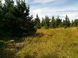 There is no tourist trail leading to the peak. The summit area is forested with spruce, covered with alpine grass, and features a wooden fence to the east, erected by forestry services around a closed wildlife feeding area of about 0.3 km².[2][7] Additionally, the summit area is at the intersection of field roads leading to neighboring peaks such as Medvědí vrch and Medvědí louka.[7] Due to the increasing height of the forest over time, the summit area is not a viewpoint. At the summit, there is a triangulation station, marked on geodetic maps with the number 22, with an elevation of 1,203.58 meters above sea level and geographic coordinates 50°10′35.76″N 17°17′55.53″E / 50.1766000°N 17.2987583°E / 50.1766000; 17.2987583.[6]