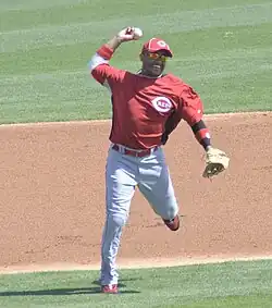 On February 1, 2010, Cabrera signed a one-year contract with the Cincinnati Reds that included a mutual option for 2011.[25] Cabrera spent the season as the Reds shortstop and posted a .263 average with four home runs, 42 RBI, and a .303 on-base percentage.[8] Cabrera played in only 123 games due to a strained oblique muscle that kept him on the DL from August 3 to September 3.[26] The injury continued to bother him in September and into the playoffs, culminating with Dusty Baker giving him the start in Game 3 of the NLDS despite Cabrera mentioning pain. In the first inning, Cabrera made a high throw to first that allowed a run to score.[27] While on the disabled list, Cabrera spent one game in full batboy uniform, bringing balls to the umpire and collecting bats.[28]