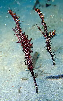Solenostomus paradoxus, the ornate ghost pipefish or harlequin ghost pipefish, is a false pipefish of the family Solenostomidae. The species' name comes from the Greek paradoxos, referring to this fish's unusual external features. With its common name, ghost, referring to its ability to disguise itself and appear and disappear quickly. Alluding to the fact that even though it’s a relatively common fish, ornate ghost pipefish are very well-camouflaged and difficult to find.