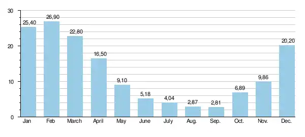 The Orne exhibits strongly marked seasonal fluctuations, such as are very often found in the east of France, with high water in winter/spring bringing the monthly average up to between 20.2 and 26.9 cubic metres per second (710 and 950 cu ft/s) from December to March inclusive, with a maximum in February. Summer low waters are quite prolonged, from June to early October, with a low monthly average of 2.81 cubic metres per second (99 cu ft/s) in September. These monthly figures, however, are just averages, and conceal even more pronounced short-term variation.