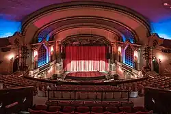 The 42 feet (13 m) high by 40 feet (12 m) wide proscenium arch is the main feature of the auditorium. The sidewalls of the auditorium were accented by niches with mock tile roofs, grills, and wood lattice arches across the ceiling to create a courtyard effect.[2]