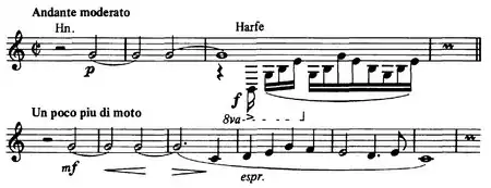 Formally, Orpheus is a modified sonata form with a secondary key area containing two themes. The second theme lacks the energy of the first, remaining a static motif hovering over oscillating major and minor harmonies. Nevertheless, it contains an especially poignant quality. This theme is presented by various solo instruments to a primarily harp accompaniment. The orchestration, together with the style, suggests an interpretation of this theme as Orpheus' voice.[5]