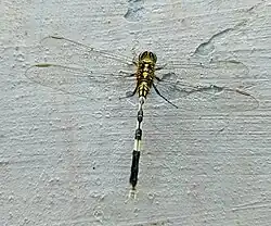 It is a medium-sized dragonfly with a wingspan of 60-85mm. Adults are greyish to greenish yellow with black and pale markings and green eyes. Its abdomen is greenish-yellow, marked with black.[8] It is very similar to Orthetrum serapia in appearance, with both species appearing in northern Australia. Pale markings on segment four of the abdomen do not extend into the posterior section when viewed from above on Orthetrum sabina. Females are similar to males in shape, colour and size; differing only in sexual characteristics.[8][9] This dragonfly perches motionless on shrubs and dry twigs for long periods. It preys voraciously on smaller butterflies and dragonflies.[8][10][11][12]