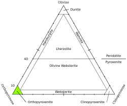 Orthopyroxenite is an ultramafic and ultrabasic rock that is almost exclusively made from the mineral orthopyroxene, the orthorhombic version of pyroxene and a type of pyroxenite. It can have up to a few percent of olivine and clinopyroxene.