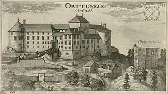 In 1161, Count Otto II of Ortenburg erected a small fort at the site. By the early 15th century the castle was inherited by the Counts of Celje; in the late 15th century it passed from the Habsburgs to the house of Lamberg. Peasant revolts and Ottoman raids damaged the castle, necessitating a thorough Renaissance rebuilding. Sold off in the late 16th century, it lost most of its importance. Another remodeling followed in the 17th century, by the Counts of Moscon; the castle chapel of St. George dates from this phase. Its final owners were the Kosler family; The castle was acquired in 1823 by Johann Kosler Sr. (1780–1864),[1] the father of Peter Kosler. Johann Kosler Jr. (1819–1898)[1] and his family moved from the castle to the more convenient Lower Ortnek Castle on the road from Ljubljana to Kočevje in 1884. The last owner of the castle was Oskar Kosler (1898–1959), who lost the property when it was nationalized by Slovenia's postwar communist government in 1946.[2]
