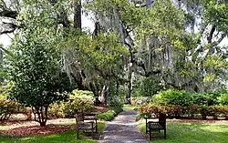 Orton Plantation Gardens contains 20 acres (81,000 m2) of lawns and formal gardens, as well as 60 acres (24 ha) of fountains, statues, forests, lagoons, old rice fields, and a family cemetery. The garden features tree-lined brick paths and rows of camellias, dogwoods, magnolias, crape-myrtles, annuals, and perennials. The front gates of the property are topped with cement eagles which lead to a dirt path driveway lined with large oak trees draped in Spanish moss that were planted in the 18th century.[3][7][15]