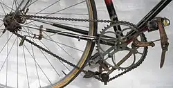 Egg introduced his first derailleur, called Champion, in 1932.[11] It supported as many as 3 different gear ratios and consisted of two parts: a fork mounted near the rear sprocket for moving the chain and a separate tension arm mounted near the front chainring for taking up slack.[11] Shifting gears required back-pedaling.[11] He followed up in 1933 with the Super Champion.[11] It was the official derailleur of the French, Belgian, Spanish, and German Tour de France teams in 1937, the first year that derailleurs were permitted in the race.[11] The device became so popular that more than 1 million were manufactured by 1939.[11]