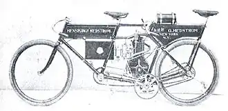 In his spare time Hedstrom built high-quality bicycles that were lighter and more durable than standard bikes. He rented a workshop space in Middletown, Connecticut where he designed and cast engines from his own patterns. He also designed and build a concentric carburetor.[3] While his reputation as a bicycle designer grew, he started to build tandem bicycles with gasoline engines. These were called pacers, and were used to split the wind for racing cyclists. The motorized pacers of that time functioned poorly, but Hedstrom's design quickly gained a reputation as being very reliable.[4][5]