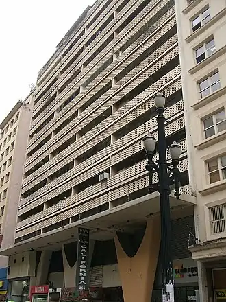With the success of Pampulha and the Brazil Builds exhibition, Niemeyer achieved international recognition. His architecture further developed the Brazilian style that the Saint Francis of Assisi Church and, to a lesser extent (due to its primary Corbusian language) the Ministry building, had pioneered. Works of this period shows the traditional modernist method in which form follows function, but Niemeyer's (and other Brazilian architects) handling of scale, proportion and program allowed him to resolve complex problems with simple and intelligent plans.[16] Stamo Papadaki in his monography on Niemeyer mentioned the spatial freedom that characterized his work. The headquarters of the Banco Boavista, inaugurated in 1948 show such an approach.[17] Dealing with a typical urban site, Niemeyer adopted creative solutions to enliven the otherwise monolithic high rise, thus challenging the predominant solidity which was the norm for bank buildings.[18] The glazed south façade (with least insulation) reflects the 19th century Candelária Church, showing Niemeyer's sensitivity to the surroundings and older architecture. Such austere designs to high rises within urban grids can also be seen in the Edifício Montreal (1951–1954), Edifício Triângulo (1955) and the Edifício Sede do Banco Mineiro da Produção.