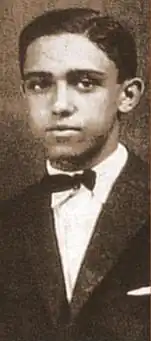 Niemeyer was born in the city of Rio de Janeiro on 15 December 1907.[3] His great-great-grandfather was a Portuguese immigrant who, in turn, was the son of a German soldier who had settled in Portugal.[6][7] Niemeyer spoke about it: "my name ought to have been Oscar Ribeiro de Almeida de Niemeyer Soares, or simply Oscar de Almeida Soares, but the foreign surname prevailed and I am known simply as Oscar Niemeyer".[8] He spent his youth as a typical young Carioca of the time: bohemian and relatively unconcerned with his future.[9] In 1928, at age 21, Niemeyer left school (Santo Antonio Maria Zaccaria priory school) and married Annita Baldo,[3] daughter of Italian immigrants from Padua. He pursued his passion at the National School of Fine Arts in Rio de Janeiro and graduated with a BA in architecture in 1934.[3]