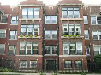 The Oscar Stanton De Priest House is located on Chicago's South Side community area of Grand Boulevard, on the west side of King Drive south of 45th Street. It is an architecturally-unexceptional three-story masonry structure built of brick with stone trim, with a full basement. It houses eight units, two to each floor including the basement. Its dominant features are projecting rectangular bays on both sides of the recessed entry, with bracketed flower boxes on the second and third floors and a bracketed cornice below the roof. Based on its styling, it was built about 1920.[4]