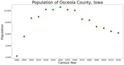 Osceola County (/ˌɒsiˈoʊlə/ OSS-ee-OH-lə) is a county located in the U.S. state of Iowa. As of the 2020 census the population was 6,192, making it the state's fifth-least populous county.[1] It is named for Seminole war chief Osceola. The county seat is Sibley, named for H. H. Sibley of Minnesota.[2]