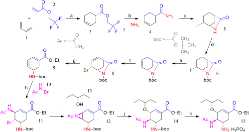- ^ Yeung, Ying-Yeung; Hong, Sungwoo; Corey, E. J. (2006). "A Short Enantioselective Pathway for the Synthesis of the Anti-Influenza Neuramidase Inhibitor Oseltamivir from 1,3-Butadiene and Acrylic Acid". J. Am. Chem. Soc. 128 (19): 6310–6311. doi:10.1021/ja0616433. PMID 16683783. S2CID 20852603.