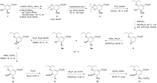 The current production method is based on the first scalable synthesis developed by Gilead Sciences[4] starting from naturally occurring quinic acid or shikimic acid. Due to lower yields and the extra steps required (because of the additional dehydration), the quinic acid route was dropped in favour of the one based on shikimic acid, which received further improvements by Hoffmann-La Roche.[5][6] The current industrial synthesis is summarised below: