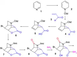 An approach published in 2007[12] like Corey's starts by an asymmetric Diels-Alder reaction this time with starting materials pyridine and acrolein.