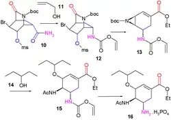 - ^ Mita, Tsuyoshi (2007). "Second Generation Catalytic Asymmetric Synthesis of Tamiflu: Allylic Substitution Route". Organic Letters. 9 (2): 259–262. doi:10.1021/ol062663c. PMID 17217279.
