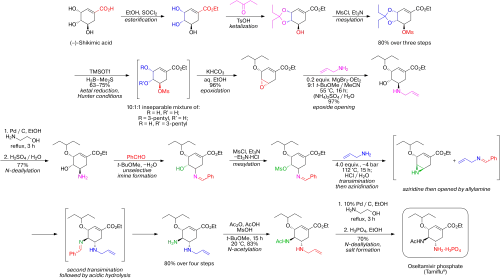 - ^ Karpf, M; Trussardi, R (March 2001). "New, azide-free transformation of epoxides into 1,2-diamino compounds: synthesis of the anti-influenza neuraminidase inhibitor oseltamivir phosphate (Tamiflu)". J. Org. Chem. 66 (6): 2044–51. doi:10.1021/jo005702l. PMID 11300898..