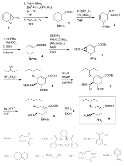 Oseltamivir total synthesis concerns the total synthesis of the anti-influenza drug oseltamivir[1] marketed by Hoffmann-La Roche under the trade name Tamiflu. Its commercial production starts from the biomolecule shikimic acid harvested from Chinese star anise and from recombinant E. coli.[2][3] Control of stereochemistry is important: the molecule has three stereocenters and the sought-after isomer is only 1 of 8 stereoisomers.