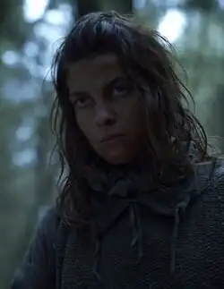 Osha travels with the Stark boys, their direwolves, and Hodor as they head for the Wall. They are crossed by the Reed siblings, Jojen and Meera, who try to reason with Bran. Jojen reveals who they are, and that Bran has a mission to reach the Three-Eyed Raven Beyond the Wall. Over time, Osha grows wary of Jojen and his ideas, and tries to confront him about putting ideas into Bran's head. Jojen reveals that they have no plan of going to the Wall, but instead insists on traveling Beyond the Wall to seek the Three-Eyed Raven. Outraged, Osha warns them of the dangers and threats that lie ahead, which provokes her to tell them about her husband, Bruni, revealing that he had gone missing and came back days later as a White Walker and almost killed Osha.[21] She burnt down her hut with Bruni inside and fled south of the Wall before the dangers became prominent.[22] With her motivations clear, Osha tells Bran she will not go further than the Wall and will not break her promise to Luwin.[23] During a storm, the group take refuge inside an abandoned windmill, while a group of wildlings outside fight. Jojen reveals to Bran that he is a warg after accidentally warging Hodor, which leads him to warging himself into Summer and unknowingly saves Jon Snow and Ygritte. Osha is still frustrated over the entire situation, but Bran suggests that she take Rickon to Last Hearth to seek refuge with House Umber, loyal allies to House Stark. Agreeing, Osha and Rickon say their goodbyes, and part ways.[24]