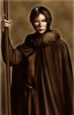 In the novels, Osha was first introduced in A Game of Thrones (1996) as a wildling woman from Beyond the Wall who worships the Old Gods of the Forest.[2] Attempting to flee from the Others (known as the White Walkers in the television series), she ventures south of the Wall to escape the potential war that is about to come. However, Osha is initially spared by the Starks of Winterfell, and temporarily imprisoned by them due to her wild nature. She later gains the trust of the people of Winterfell, and eventually befriends Bran and Rickon Stark, and acts as their guardian. Osha later returns in A Clash of Kings (1998) and helps the Stark boys flee from Theon Greyjoy and survive the Sack of Winterfell. She then makes the decision to escort Rickon to safety while Bran heads north, and puts Maester Luwin out of his misery.[3] Although her whereabouts remain unknown for some time, she is mentioned several times in A Storm of Swords (2000) and A Feast for Crows (2005). In A Dance with Dragons (2011), it is revealed that Osha, Rickon, and Shaggydog are currently seeking refuge at Skagos.[4]