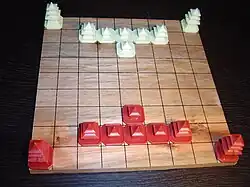 Oshi (Kanji: 押) is a strategy board game published by WizKids and designed by Tyler Bielman. Oshi is played on a 9×9 board and each player controls a set of 8 pieces (colored oxblood or ivory).