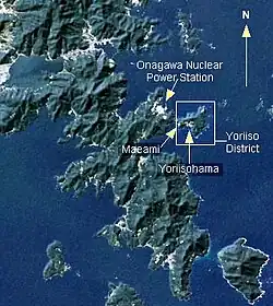One of the hamlets affected by the tsunami was Yoriisohama (寄磯浜) located about 1 km east of the Onagawa Nuclear Power Plant, on a headland comprising cliffs and small fjord-like bays on the eastern side of the Oshika Peninsula. The main settlement is in a south-facing bay on the southern slope of Azumamori Mountain (東森山, Azumamoriyama), (153m high).[5] Yoriiso was founded in the 14th century. Local legend has it that its name arose from a rock which was washed onto the beach and which was venerated by the villagers. (寄る 磯 (yoru iso) = "the seashore rocks approach").[5] Formerly part of the town of Oshika, the hamlet became part of Ishinomaki. In April 2005.[6] As of 2005 Yoriisohama consisted of about 100 households, with a population of about 500, mainly engaged in fishery and related occupations. Historically, Yoriiso included the hamlet of Maeami (前網) 500 metres to the west (population 100 / 25 households).[5]