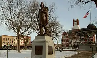 In the city's town square is a bronze statue of Chief Mahaska, the 19th-century leader of a Native American tribe called the Ioway; he was memorialized by the name of Mahaska County. Restored in the 21st century, the statue was completed in 1907 by an Iowa-born sculptor named Sherry Edmundson Fry (1879–1966). At the time it was commissioned, Fry was living in Paris. He returned to Iowa the following summer to make preparatory drawings of Meskwaki at the nearby Settlement at Tama, Iowa, and to collect Indian artifacts and other reference materials. Returning to Paris, he began on a clay scale model, which he first showed at the Paris Salon in 1907. A year later, Fry exhibited the final full-sized sculpture, for which he won the Prix de Rome. Soon after, it was shipped to the United States, and arrived in Oskaloosa by railroad in September. The formal dedication of the statue was held on May 12, 1909, and attended by a crowd of about 12,000 people.