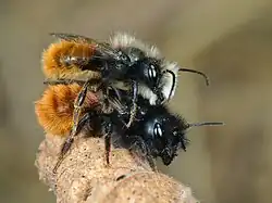 Osmia cornuta does not live in colonies in hives like bumble bees and honey bees. It nests in existing cavities of various shapes and sizes: cracks in walls, holes in plastering, drainage pipes and cracks in window frames, recesses in stones, old nests of fur bees (Anthophora plumipes, Anthophora fulvitarsis) and of Delta unguiculata. Also colonizes nesting aids (e.g. holes in wood, bamboo cane, preferred inner diameter 8–9 mm. Length 20–25 cm), provided these are attached directly to the house wall or other larger areas. The nests are mostly linear structures with up to 12 brood cells. In larger cavities, however, the brood cells are occasionally built together irregularly. Moist earth or loam collected at the edges of the water is preferably used as building material. When the ground is very dry on the surface, numerous females often gather in the same place, looking for cracks in the ground or digging holes several centimeters deep in the ground in order to get to moist building material. The mortar is mixed with saliva.[3][4]