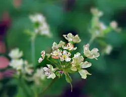The inflorescence is a compound umbel of many tiny greenish yellow flowers at the tip of a stemlike peduncle. The narrow, elongated fruit is ribbed and bristly, measuring up to 2 centimeters long.
