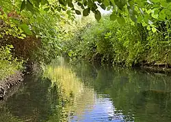 In this urban setting, Osney Ditch supports a variety of wildlife and habitats.[5] Its slow-flowing, freshwater environment, with sections of both shaded and open banks, provides niches for aquatic and riparian species. The banks of the ditch are lined with waterside trees — such as willows — and wetland plants thrive along the margins. Yellow flag iris (Iris pseudacorus) is one native plant that flourishes by this stream. Reeds, sedges, and other hydrophilic plants form dense growth in shallower stretches, offering cover and stabilizing the banks.
