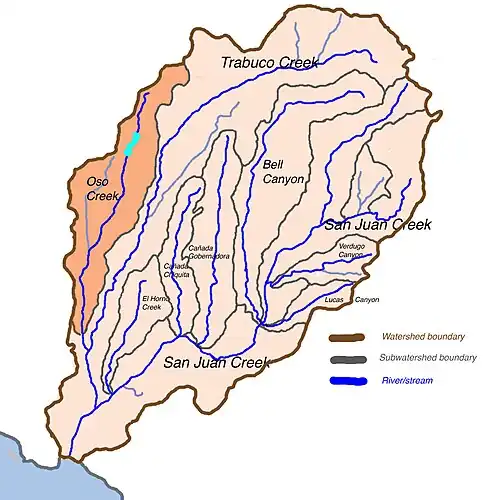 Occupying the west and northwest portions of the San Juan Creek watershed, the 25-square-mile (65 km2) Oso Creek watershed comprises about 18% of the 133-square-mile (340 km2) San Juan Creek watershed. It includes parts of the cities of Mission Viejo, Laguna Niguel, and San Juan Capistrano. Most of the watershed is used for residential, commercial, and agricultural purposes. Oso Creek runs parallel to Trabuco Creek, while Salt Creek is to the southwest, Sulphur Creek to the west, and Aliso Creek to the northwest.[5]