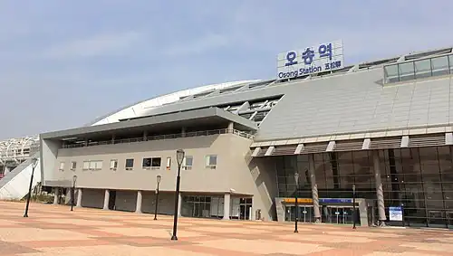 Osong station (Korean: 오송역) is a train station on the Honam and Gyeongbu high-speed railways in Cheongju, North Chungcheong Province, South Korea. It is located at the intersection of the Gyeongbu KTX high-speed rail line, the conventional Chungbuk Line and, since April 2015, the Honam high-speed railway.[1] KTX trains began calling there from November 1, 2010, bringing high-speed rail service to the nearby city of Cheongju.