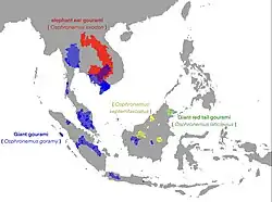 Osphronemus is a genus of large gouramis, the only genus within the subfamily Osphroneminae. These fish are known as the giant gouramis and are native to rivers, lakes, pools, swamps and floodplains in Southeast Asia, with O. exodon from the Mekong basin, O. laticlavius and O. septemfasciatus from Borneo, while O. goramy is relatively widespread.[1][2][3] O. goramy has been introduced outside its native range in Asia, Africa and Australia.[4]