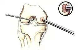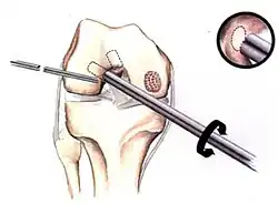 In attempts to address the weaker structure of the reparative fibrocartilage, new techniques have been designed to fill the defect with tissue that more closely simulates normal hyaline articular cartilage. One such technique is autologous chondrocyte implantation (ACI), which is useful for large, isolated femoral defects in younger people. In this surgery, chondrocytes are arthroscopically extracted from the intercondylar notch of the articular surface. The chondrocytes are grown and injected into the defect under a periosteal patch. ACI surgery has reported good to excellent results for reduced swelling, pain and locking in clinical follow-up examinations.[58][59] Some physicians preferred to use undifferentiated pluripotential cells, such as periosteal cells and bone marrow stem cells, as opposed to chondrocytes. These too have demonstrated the ability to regenerate both the cartilage and the underlying subchondral bone.[60]