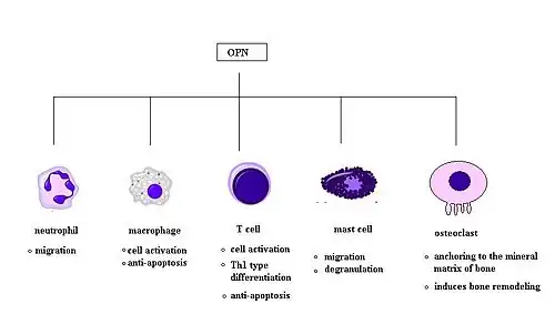 Osteopontin (OPN) is expressed in a range of immune cells, including macrophages, neutrophils, dendritic cells, microglia and T and B cells, with varying kinetics. OPN is reported to act as an immune modulator in a variety of manners.[7] Firstly, it has chemotactic properties, which promote cell recruitment to inflammatory sites. It also functions as an adhesion protein, involved in cell attachment and wound healing. In addition, OPN mediates cell activation and cytokine production, as well as promoting cell survival by regulating apoptosis.[7] The following examples are found.[7]