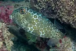 The shortnose boxfish has 9 soft rays supporting both the dorsal and anal fins while the caudal fin has 10 rays, 8 of which are branched. Males have a short blunt, conical protuberance above the mouth and in front of the eyes.[5] The snout has a concave profile.[6] The juveniles and smaller females are pale grey to silvery white on the carapace with scattered, small black spots on the caudal peduncle and base of the caudal fin peduncle and caudal-fin base, with scattered black spots. The males have a white carapce and caudal peduncle which is patterned with irregularly shaped pale yellowish-green blotches. The upper body has a dense covering of black spotsmwhich form a dark reticulated pattern.[5] This species has a maximum published total length of 30 cm (12 in).[6]