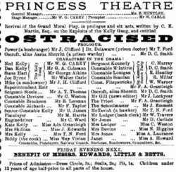 A writer claimed prior to a performance of the play in Benalla, local police advised the removal of the prologue involving Harry Power, and this was done. Mrs Kelly reportedly attended this performance.[16] Reporting on this performance the Benalla Standard said "the audience... throughout were orderly; and although several well-known Kelly sympathisers were present, the attendance of the three policemen on duty was not required."[17]